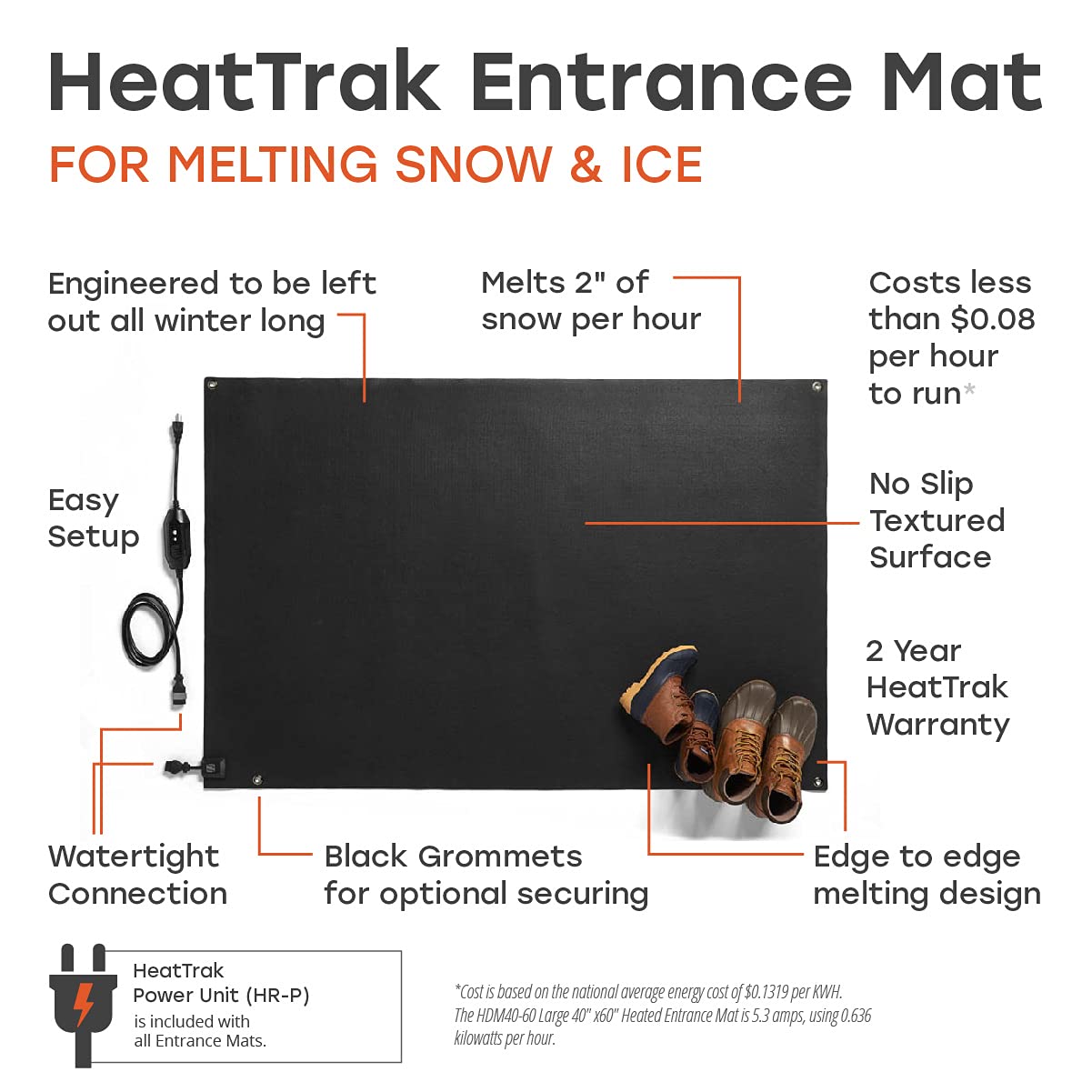 Remove the struggle of opening a door overtaken by snow with the one click convenience of HeatTrak Entrance Mats. Mats come with an outdoor-safe Power Unit and are a complete standalone snow Melting System. The Entrance Mat connects to the Power Unit through a watertight connector. Available in three sizes, an Entrance Mat is the perfect start to your HeatTrak Snow Melting System. This electric heating mat melts snow on contact to prevent snow and ice accumulation on walkways around the home.Simple to use: Just lay it out, plug it in, and watch snow melt on contact. No more Shoveling, No more Salting, and No more Slipping!Each Residential Entrance Mat is a standalone mat with its own power source (included). Please note that the entrance mats can’t connect to other HeatTrak Stair and Walkway mats.Size: 30 Inches x 48 InchesAmps: 3.2, Voltage: 120VMaterial: Customized Thermoplastic.When ordering, remember these important points: This mat is for snow-melting only; Never cover mats, never use indoors, and never use for animals or animal houses. Do not use on composite decking. The mat is waterproof and designed to be left outside all winter long. Residential Products can only connect to Residential Products; They do not connect to Industrial Products.Each mat sold separately.